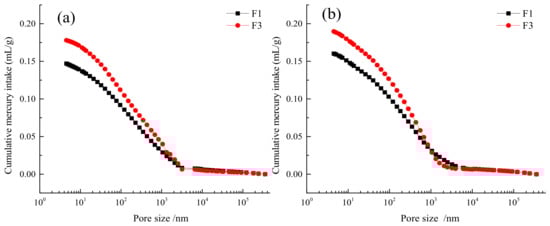 Relationship between cumulative mercury compression and pore size of the filler at different maintenance ages of F1 and F3 groups with high fly ash content: (a) 7 d, (b) 28 d.