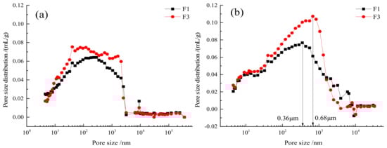 Relationship between differential mercury compression and pore size of the filler at different maintenance ages of F1 and F3 groups with high fly ash content: (a) 7 d, (b) 28 d.