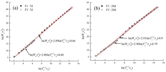 Formula (5) can be modified into a form of (7), in order to eliminate the trial and error and iteration processes. The MIP data were fitted according to (7), thereby deriving the pore fractal model scatter diagrams of the 7-d and 28-d slurries with different fly ash contents and ages. From Figure 10, it is clear that the age and fly ash content basically exerted no effect on the surface roughness of slurry pores, only causing the expansion of pore structures. This suggests that the excess fly ash played a physical filling role.