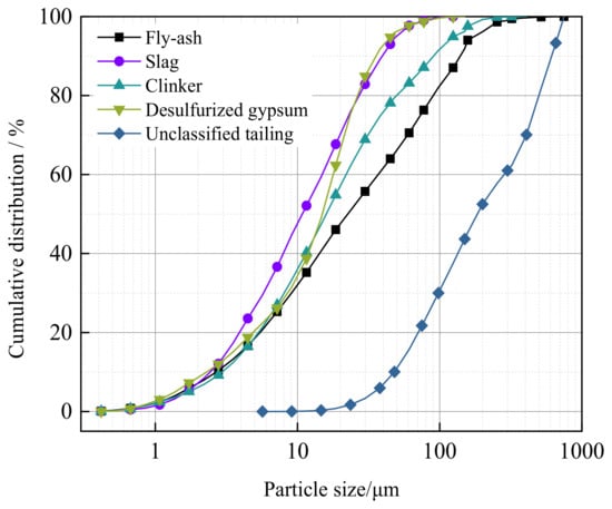 The filler aggregate was full tailings from the Huangtupo copper–zinc mine. The cumulative particle size distributions of cementitious material and full tailings were measured via LS-POP(9) laser particle size analyzer, as shown in Figure 11. The tailings had relatively coarse particles, with an unevenness coefficient Cc of slightly greater than 5, indicating narrow size distribution of the tailings particles []. Moreover, a curvature coefficient of Cu < 1 indicates lack of medium particle sizes (48.04–285.35 μm). Meanwhile, the fly ash was grade III, with a fineness of 37% and d60 = 37.04 μm, which could improve the full tailings gradation to some extent.