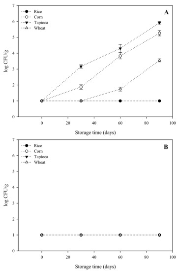 Growth curves of aerobic mesophilic total count (A) and yeasts and molds (B) of starch-based HPP hydrogels during the storage period. Symbols are means of three measurements ± standard deviations (S.D).