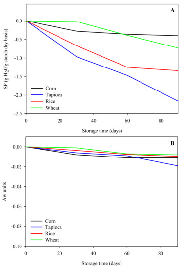 At the beginning of the storage period (0 days), starch-based HPP hydrogels presented similar Aw values (in the range of 0.974–0.969). Tapioca starch hydrogels showed the highest initial SP values (7.4 g H2O/g dry starch), followed by rice (6.5 g H2O/g dry starch), corn (5.4 g H2O/g dry starch), and wheat starch hydrogels (5.16 g H2O/g dry starch). These results can be explained by the higher capacity of tapioca starch granules to swell and solubilize with respect to cereal starch granules and the absence of amylose–lipid complex formation, as reported elsewhere [14,22,35].