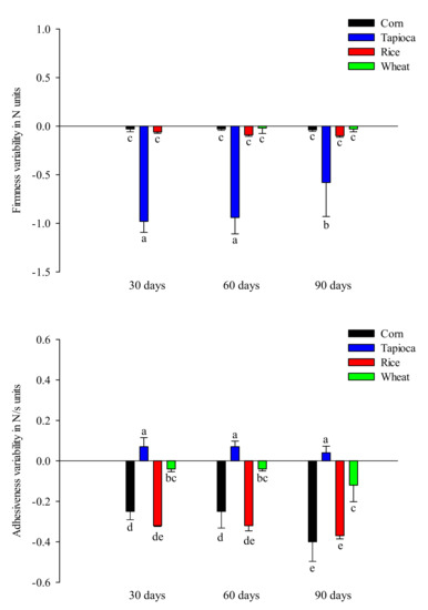 The physical stability of polymeric materials is defined as the extent to which a product retains, within the specified limits, the same properties and physical characteristics possessed at the time of its packaging [26]. Texture measurements represent valuable tools to quantify the physical properties of polymeric materials such as starch-based hydrogels. Moreover, based on our previous findings [12], the firmness and adhesiveness are the parameters characterizing the texture of starch-based HPP hydrogels. Consequently, the trends of these two parameters were determined for rice, wheat, corn, and tapioca starch hydrogels during the storage period and the data are reported in Figure 3 as the delta of current and initial values.