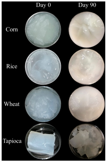 In agreement with the results of the previous sections, tapioca starch hydrogels showed more significant organoleptic changes than rice, corn, and wheat hydrogels. Syneresis and phase separation after the first month of storage, and consequently, the rupture of the structure after 60 days, were detected via the organoleptic evaluation as the main physical changes of tapioca starch hydrogels during storage. Interestingly, only slight organoleptic modifications of rice starch hydrogels were observed during the storage period (Table 1, Figure 4). These findings suggest that the organoleptic changes in starch-based hydrogels are strongly influenced by the actions of microorganisms, which produce network deteriorations and facilitate starch retrogradation. Moreover, the level of the organoleptic changes depended on the structural characteristics of each hydrogel (Figure 4). For instance, in cream-like structures such as rice, corn, and wheat hydrogels, the organoleptic changes are less visible than in rubber-like structures such as tapioca starch hydrogels, highlighting the importance of instrumental determination in the evaluation of the physical stability of such gel structures.