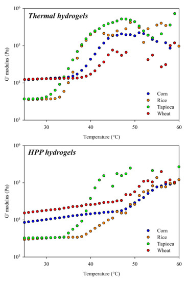 From Figure 5, it can be observed that the temperature increments influenced the rheological properties of starch-based HPP hydrogels to different extents. Elastic instabilities occurred in corn and wheat HPP hydrogels over 47 °C, whereas the same instabilities were detected in rice and tapioca HPP hydrogels at 39 °C and 35 °C, respectively. Moreover, the inflection points of G′ curves, corresponding to the temperatures affecting the gel-like profiles of hydrogels, were always observed at higher temperature values (±6.5 °C average) in hydrogels produced using high-pressure processing than in those obtained with thermal processes, suggesting a superior thermal stability of the former ones.