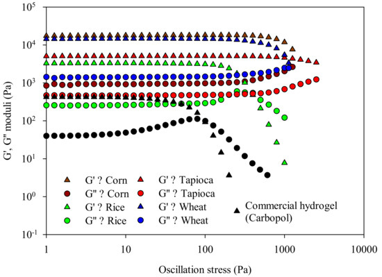The network strength of starch-based HPP hydrogels, and for the sake of comparison of a commercial hydrogel, namely Carbopol, was evaluated through stress sweep tests. In Figure 6, the data of the viscoelastic responses (G′ elastic and G″ viscous moduli) of corn, rice, tapioca, wheat hydrogels, and Carbopol subjected to a deformation (oscillation) stress ramp are reported.