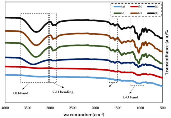 There is motionless a noteworthy wide band at 3300–3500 cm−1, despite the possibility of overlap between the N–H and O–H stretching vibrations. Figure 2 shows that as the plasticizer is increased, the bands become more intense and the wavenumber decreases. In the bands of amine (NH2) and (O–H) groups, there is a trend towards lower wavenumbers, as seen in Table 2. This strongly suggests that complexation is happened between the electrolyte’s constituents [23,36]. The shift and reduction in relative strength of these bands is due to the electrostatic interaction between the ions and the functional groups of the CS:PVA polymer blend [37]. Furthermore, the N–H stretching vibration’s shift to lower wavenumbers shows that CS’s intermolecular and intramolecular hydrogen bonds have decreased [38]. Recent research has shown that the carboxyl (–C=O), hydroxyl (–OH), and amine (–NH) groups all have a role in salt interaction [39]. This band’s shifting and changing strength specify a superior interaction between the electrolyte’s blended host polymer, salt, and plasticizer. The vibrational and stretching modes in the FTIR spectra vary as a consequence of the interaction between the electrolyte components (shown in the table below) [22,40]. This enhanced interaction promotes ion dissociation, which is beneficial to the electrolytes’ ionic conductivity [40,41]. The rise in ionic conductivity is corroborated by this increase in intensity (see Figure 2).