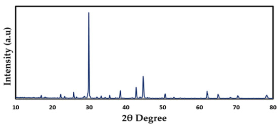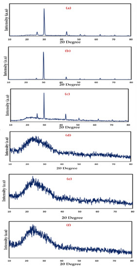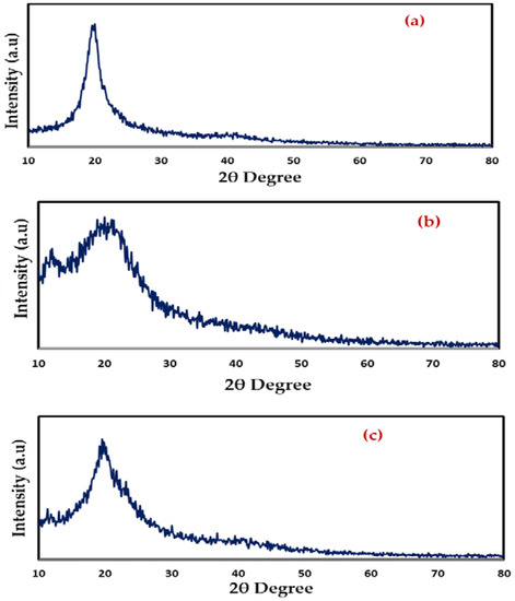 Figure 3 shows XRD results for room-temperature PVA, CS, and CS:PVA (a–c). In contrast to the semi-crystalline character of pure PVA (Figure 3a), the CS exhibits crystallinity maxima at some 2θdegree values (Figure 3b) [42]. Since OH groups are present everywhere throughout PVA and CS’s main chain, it is able to form strong inter- and intramolecular hydrogen bonds. Amorphous phases in PVA are responsible for the large peak at 2θ = 40.7° which is due to existing high water content [43]. The XRD pattern of CS: PVA (Figure 3c) revealed two hallows and smaller crystalline peaks in the current study. It is worth noting that, as the vast hallows demonstrate, CS: PVA is less crystalline than pure PVA or CS alone, and its structure is practically amorphous [44,45]. According to previous research, the amorphous structure of PEs is linked to large diffraction peaks [46].