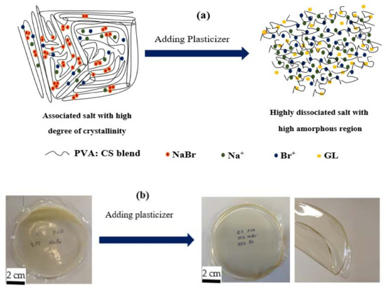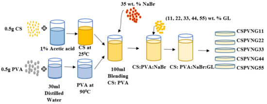 Acetic acid solvents were prepared by adding 1 mL of glacial acetic acid into 99 mL of distilled water. 0.5 g of CS was dissolved in 70 mL of the prepared (1%) acetic acid at ambient temperature and 0.5 g of PVA was dissolved in 30 mL distilled water at 90 °C under stirring. After cooling to room temperature, the PVA solution was mixed with dissolved CS. Using a magnetic stirrer, the solution was continuously stirred for 24 h to obtain an identical PVA:CS solution. To make ion-conducting PEs, sodium salt was used. For this purpose, 35 wt.% NaBr salt was added to the PVA:CS solutions under stirring and then addition of varying concentrations (11, 22, 33, 44, and 55 wt.%) of GL as plasticizers into the PVA:CS:NaBr solution were carried out. In order to obtain a dry film free of solvent at room temperature, the solutions were deposited in numerous plastic Petri dishes (8 cm in diameter). This procedure is seen in the Figure 16. The 0.023 mm-thick flexible films were then created.