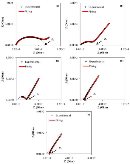 The real and imaginary sections of semicircles are attributed to the first half of Equations (8) and (9), while spike lines are attributed to the second part. Where C1 indicates CPE1’s bulk capacitance and C2 denotes CPE2’s capacitance at the electrode-electrolyte interface. In Table 3, the EEC fitting parameters are listed. In the high frequency region, the semicircle size drops significantly as the amount of GL increases, as seen in the impedance spectra. Figure 7a,b show how to model an incomplete semicircle in which the value of Rb is in series with one CPE element and parallel with another CPE element (at low frequency tail). Figure 7c–e illustrate the complete elimination of the incomplete semicircle. Given the Rb values and the film thickness, calculation of the DC conductivity can be performed using Equation (4) [63].