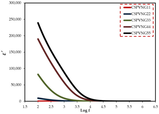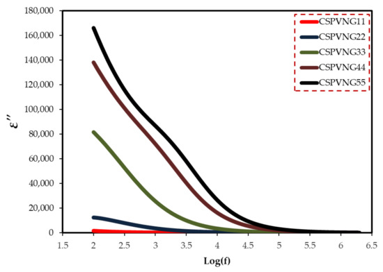 For determining the electrical characteristics of many materials, including glasses, semiconductors, polymers, and transition metal oxides, impedance spectroscopy may be a valuable instrument [9,40]. CIS relies on a number of other measured or calculated parameters. The measurement, analysis, and charting of some or all of the four impedance-related functions (Z*, Y*, M*, and ε*) in the complex plane is referred to as impedance spectroscopy [75]. Dielectric measurements (ε*), such as dielectric constant (ε′) and dielectric loss (ε′′), disclose a lot about polymer chemical and structural behavior. Using Equations (9) and (10), the real and imaginary parts of dielectric function were evaluated [76]. Because of the electrode polarization (EP) effect [77], both of them (ɛ′ and ɛ′′) are quite high at low frequencies, as seen in Figure 9 and Figure 10. The inclusion of another polymer or a dopant in the polymer has a significant impact on these properties (ɛ′ and ɛ′′) [56]. In polymer electrolyte systems the polarization can be resulted from both permanent dipole of host matrix functional groups and space charge polarization at the electrode/electrolyte interface. As can be seen in Figure 10, the dielectric loss has recorded high value at low frequency region due to the plenty of time that is provided by the applied field for re-orientation. In addition, the increasing plasticizer has improved the rotation freedom of the site groups to response quickly to the applied field. These two factors have caused an enhancement in dielectric loss value. However, at high frequency regions such a high value is not observed due to the fast switching of the applied field.