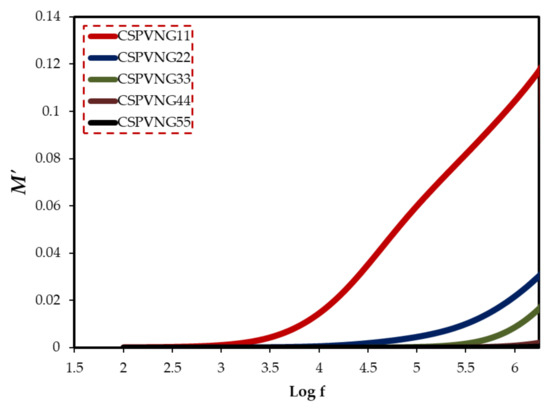 The real part of the electric modulus versus log (f) for the electrolyte samples.