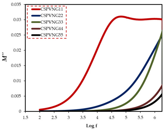 The imaginary part of the electric modulus versus log (f) for all electrolyte samples.
