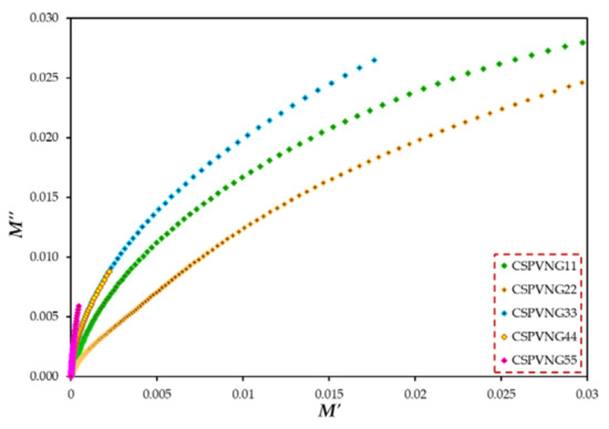 The use of Argand (M′′ vs. M′) plots to decide whether a relaxation dynamic fits in to viscoelastic or conductivity relaxation is a well-known approach. The type of relaxation processes in the current PEs can be revealed. The Argand curves for all of the samples are shown in Figure 14 at room temperature. According to [95], if the Argand plot between the imaginary component (M′′) and the real part (M′) of the electric modulus displays semicircular behavior, the relaxation is due to conductivity relaxation; otherwise, viscoelastic relaxation (or polymer molecular relaxation) is responsible [96]. The circle diameters do not line up with the real axis. This means that ion transport happens in all samples via viscoelastic relaxation. The conductivity relaxation differs significantly from the viscoelastic relaxations found in polymers. The conductivity relaxation corresponds to a single-relaxation-time Debye model process, whereas viscoelastic relaxations are known to have a dispersion of relaxation times [97].