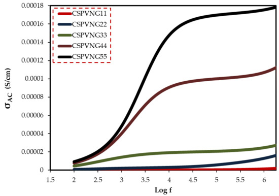 Even though experiments have been carried out on a broad range of semiconducting and insulating materials, the literature on AC conductivity in disorder solids and its characteristics with composition is valuable. In general, frequency-dependent conductivity follows a power-law behavior (σ~ωs) [98]. The properties of crystalline semiconductors and insulators have been determined by several solid state theories, but when these theories are applied to data on polymers, the predictions they produce are not sufficiently unique, making it surprisingly difficult to determine all the important characteristics of electrical conduction in polymers even today [99]. The σac were evaluated from the real (Zr) and imaginary (Zi) parts of complex impedance (Z*) using Equation (14).