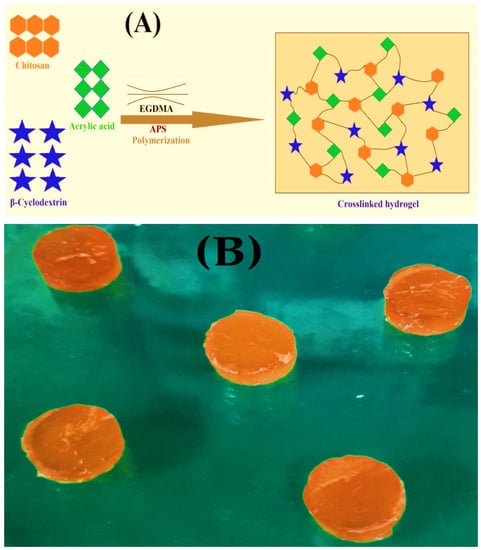 (A) Proposed schematic diagram, and (B) physical appearance of prepared CS/β-CDcPAa hydrogel.