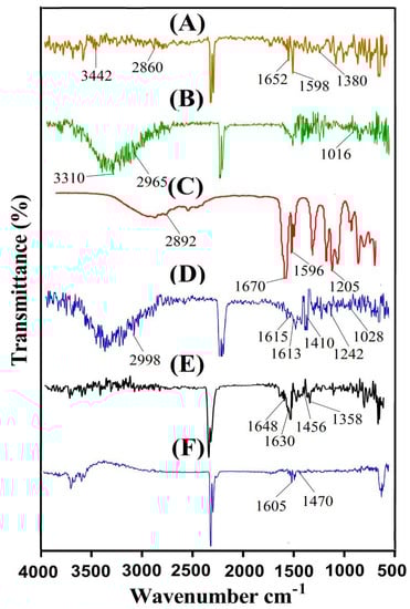 FTIR spectra of (A) CS, (B) β-CD, (C) Aa, (D) unloaded CS/β-CDcPAa hydrogel, (E) 5-ASA, and (F) loaded CS/β-CDcPAa hydrogel.