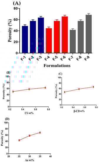 Porosity study is performed in order to evaluate the penetration of a medium into the drug carrier system [24]. An important role is played by porosity especially in swelling and drug loading of hydrogels. Channels are generated, through which water penetration of hydrogel networks occurs. The porosity of a hydrogel is influenced by various concentrations of its contents, i.e., CS, β-CD, and Aa as indicated in Figure 3A–D. Porosity was increased as the concentration of CS, β-CD, and Aa was increased. The reason may be attributed to the viscosity of the reaction mixture. High concentration of polymers and monomer led to a viscous reaction mixture, due to which the evaporation of bubbles was stopped. Thus, as a result, interconnected channels were generated. These channels increased the porosity of hydrogel and vice versa. Hence, we can conclude that high swelling and drug loading is dependent on porosity of hydrogel [25]. p-values were found to be less than 0.05 for all formulations of the fabricated hydrogel.