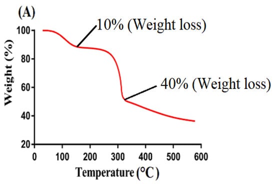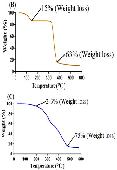 TGA is conducted to determine the thermal stability of the reagent and fabricated system individually [26]. Weight loss of individual reactant, i.e., CS and β-CD and formulated hydrogel at different temperature range was determined by their TGA thermogram as indicated in Figure 4. TGA thermogram of CS (Figure 4A) indicated a weight loss of 10% at 120 °C due to the evaporation of water. Onward temperature led to further loss of weight as almost 40% loss was detected at temperature 310 °C. After that, degradation of pure CS was begun and continued until complete degradation. Similarly, TGA thermogram of β-CD (Figure 4B) exhibited initial weight loss of 12% at 115 °C due to the loss of bounded water. A further increase in temperature up to 380 °C led to weight loss of 63%. Finally, degradation of β-CD was started at 385 °C [27]. Likewise, a TGA thermogram (Figure 4C) of developed hydrogel depicted a very minute weight loss of 2–3% at 200 °C correlated with water loss of polymers. After that, a weight loss of 75% was observed as temperature increased to 485 °C. After that, degradation of formulated hydrogel begun and continued until entire degradation. Thus, it can be concluded from a TGA thermogram of individual reactants and formulated hydrogel that thermal stability of pure CS and β-CD was enhanced due to cross-linking and grafting. The formulated hydrogel indicated a greater thermal stability as compared to unreacted CS and β-CD. Greater thermal stability of fabricated hydrogel showed strong inter-molecular interaction of contents which existed as a result of cross-linking, grafting, and polymerization [28,29,30]. Barkat and his co-worked prepared chondroitin sulfate based hydrogel and reported increase in thermal stability of the fabricated hydrogel compared to its reagent [31], which further supports our hypothesis.