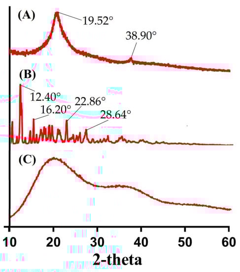 PXRD of (A) CS, (B) β-CD, and (C) CS/β-CDcPAa hydrogel.