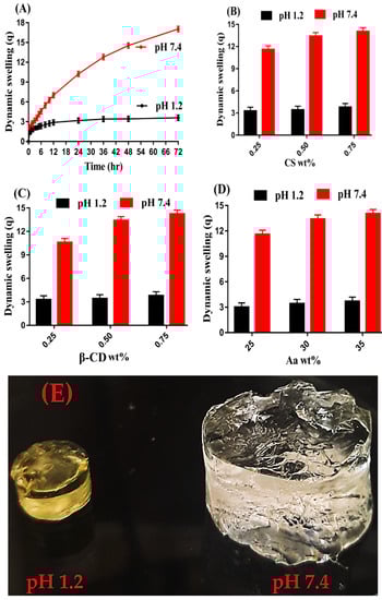 Effect of (A,) pH, (B) CS, (C) β-CD, and (D) Aa on dynamic swelling of CS/β-CDcPAa hydrogel, (E) physical appearance of swelled CS/β-CDcPAa hydrogel in pH 1.2 and 7.4.