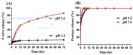 The rate of drug release from the fabricated hydrogel at a regular intervals of time is determined by dissolution studies [45]. Like swelling, the pH-responsive nature of CS/β-CDcPAa hydrogel was investigated in both pH 1.2 and 7.4. Drug release at pH 1.2 was found to be very low compared to pH 7.4, as indicated in Figure 8A. The reason may be the protonation and deprotonation of carboxylic group of Aa. At low pH 1.2, COOH groups of Aa form conjugate with counter ions and strengthen the polymeric network of the hydrogel. Thus, penetration of water was restricted, and low swelling and drug release was observed. Similarly, the NH2 group of CS remained protonated, which also led to low swelling and drug release at pH 1.2. On other hand, as the pH enhanced from 1.2 to 7.4, deprotonation of COOH groups of Aa occurred, which led to high charge density. Thus, high swelling and drug release was detected at pH 7.4 due to the presence of strong repulsive forces, which swelled the polymeric hydrogel networks [46,47]. Drug release studies were also carried out for commercial available product Pentasa (500 mg) as indicated in Figure 8B. A drug release of more than 98% was observed at pH 7.4 within an initial 4 h, while at pH 1.2, a drug release of 95% was detected within an initial 8 h. Hence, comparing the drug release of commercial product and the fabricated hydrogel, we can demonstrate that fabricated hydrogel has targeted the delivery of 5-ASA to colon effectively in a controlled fashion. Thus, the novel pH-responsive developed CS/β-CDcPAa hydrogel could be used as a suitable agent for targeted drug delivery systems.
