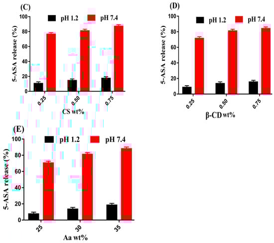 Effect of pH on (A) percent drug release from CS/β-CDcPAa hydrogel, (B) percent drug release from Pentasa, and effect of (C) CS, (D) β-CD, and (E) Aa on percent drug release from CS/β-CDcPAa hydrogel.