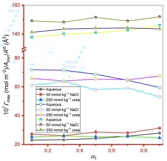 Plot of Γmax/Amin/Aid against α1 plot for IMP+TX-100 mixture in different media (filled, open, and half-filled symbols represent Γmax, Amin, and Aid, respectively).