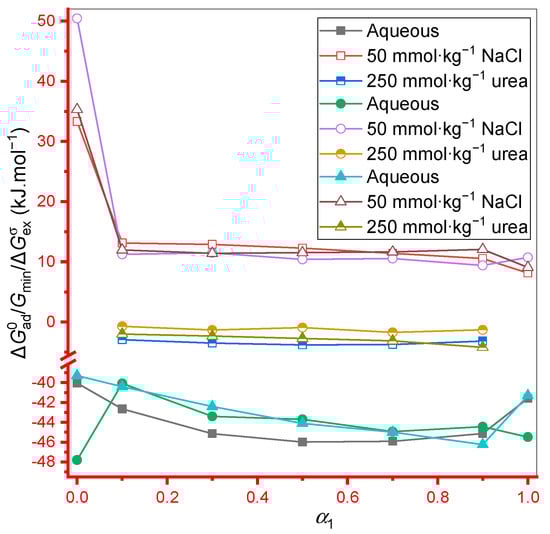 Table 2 showed the achieved value of pure and mixed systems in different media. For the calculation of of the current system, (Gibbs free energy) values were used from our previous article []. All values were negative, which was symbolic of the spontaneity of the adsorption process at the air-solvent interface and their magnitude were higher than those of the previously calculated value [] of the corresponding system. The occurrence of > hypothesized that adsorption phenomena were favored over the association process, meaning that after finishing the adsorption process, the micellization process starts, i.e., a slight effort is required to complete this phenomenon (energy supplied in micellization to bring the monomers from the surface to micellar state). The value of the IMP+TX-100 mixture at all α1 of the surfactant was more negative than the value associated with an individual component (IMP and TX-100) (Table 2). These obtained results showed that the adsorption phenomenon was additionally feasible in case of a mixed monolayer, as compared with the monolayer formed by a singular component. The value did not view any specific trends in U or NaCl media in IMP+TX-100 mixtures. In the case of pure components, in NaCl/U media their negative value was found to increase/decrease, respectively.