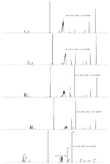 1H NMR (600 MHz) spectrum of IMP+TX-100 mixture having various α1 of TX-100 in D2O.