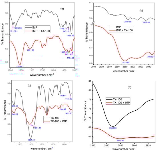 FTIR spectra of IMP (a,b) in the absence and existence of TX-100 and FTIR spectra of TX-100 (c,d) in the absence and existence of IMP in the selected wavenumber regions (cm−1).