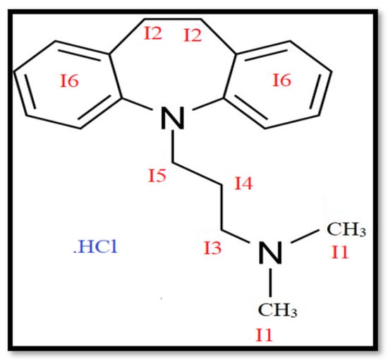 1H NMR technique is one of the finest methods for confirming the structure and purity of compounds [,]. Currently, 1H NMR is a very powerful method for examining an intermolecular interaction between both different compounds in their mixed micelles [,] and it gives us a great deal of information of interaction that is usually not available with other techniques. The present study also deals with the 1H NMR study of the interaction among the drug IMP and TX-100 surfactant in different ratios in their mixed micellar solution of an aqueous system. The 1H NMR signals of pure IMP, as well as TX-100, are clearly visible in D2O. The 1H NMR spectra of singular drug IMP and TX-100 is shown in Figure 3 with labeled hydrogen atoms attached to various carbons and obtained chemical shift value exposed in Table 3. Related data of pure TX-100 1H NMR have also been given in previously published work [,]. The spectra of pure IMP clearly show distinct six proton signals, and their corresponding proton numbers are allotted in the structure given in Scheme 2. The pure TX-100 spectra clearly show eight proton signals and the corresponding proton numbers are allocated in Scheme 3 [,]. Protons attached to -N+(CH3)2 signals (I1 protons) are highly deshielded, that is, they resonate at high δ values because of the occurrence of N-atom in the drug IMP head group. All the NMR signals in both compounds drug IMP and non-ionic surfactant TX-100 (I1-I6 and T1-T8), in their pure form, show an increase in chemical shift δ values, which shows that each proton signal was highly deshielded. The proton signal I4 resonates at low δ values. This can be clearly observed, from the change in chemical shift values of I1, I3, I2, and I5, that the proton signals that present nearby to the head group are highly deshielded because of the occurrence of an adjacent N atom, whereas the proton signal I4 is highly shielded. No doubt, due to the combined electrostatic and hydrophobic effects, the interaction is stronger. In both drug and surfactant, the aromatic protons I6, T7, and T8 resonate at high δ values, i.e., they shift downfield.