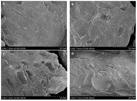 The microstructures of the original and carboxymethyl agar samples with different DS values were analyzed by scanning electron microscopy, as shown in Figure 4. The surface of the original agar (Figure 4A) was relatively smooth, without apparent holes and cracks, and the particle size was relatively large. In contrast, the particle surface of the carboxymethyl agar (Figure 4B–E) was rough and covered with depressions. For samples prepared using the microwave method, higher DS values resulted in a larger area covered with holes and depressions. However, for samples having the same DS value, the surface structures of the samples prepared by both methods were similar. Therefore, the microstructure of the carboxymethyl agar was greatly affected by the DS itself rather than by the preparation method. The origin of these morphological differences could be electrostatic repulsion between carboxymethyl groups and the destructive effect of the alkaline reaction system [34].