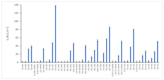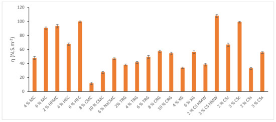 Structural viscosity of all prepared polysaccharide-based hydrogels at a shear rate of 6.45 s−1.