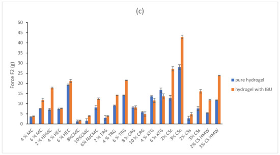 A 5% IBU content in the polysaccharide-based hydrogels changed their texture properties differently as is illustrated in Figure 3. In the majority of hydrogels, the IBU formulation led to an increase of hardness (2% HPMC, 8% and 10% CMC, 6% NaCMC, 2%, 4% and 6% TRG, 4% and 6% XTG, 2% and 3% CSc, 2% and 3% CSs, and 2% and 3% CS HMW), but in some minor cases, the hardness was decreased (4% and 6% MC, 4% and 6% HEC, 8% and 10% CRG). The adhesiveness was increased with the presence of IBU in the hydrogels composed of MC, HEC, CMC, XTG, and all types of CS. On the other hand, the adhesiveness of HPMC, NaCMC, TRG, CRG, and XTG hydrogels was decreased when containing IBU. The minimal retracting force in the majority of the hydrogels increased when implementing IBU. The CRG and XTG hydrogels were found to be the exceptions where the presence of IBU caused a decrease in minimal retracting force. In the tested IBU-containing hydrogels, the most promising for dermal application (with chosen parameters: hardness > 5 g, adhesiveness > 5 g.s. and minimal retracting force > 5 g) were 2% HPMC, 6% HEC, 6% NaCMC, 6% TRG, 4% and 6% XTG, 2% and 3% CSc, 3% CSs, and 2% and 3% CS HMW.