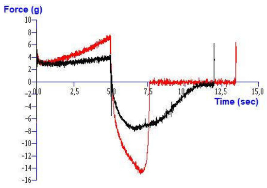Texture curve (dependence of compressing force on time) of pure 6% hydrogel of NaCMC (black curve) and 6% NaCMC containing 5% of ibuprofen (red curve).