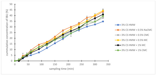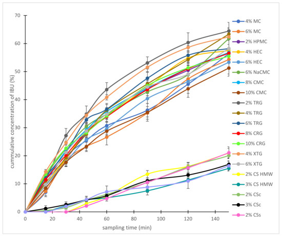 Drug release by in vitro diffusion of IBU from chosen hydrogels through semi-permeable membrane was evaluated using Franz cells and the resulting diffusion dependences are illustrated in Figure 5. The amount of released IBU after 150 min was compared for individual hydrogels and the results are shown in Figure A3 in Appendix A. The amount of released IBU increased in order 3% CS HMW (15.5%), 3% CSs (16.9%), 3% CSc (17.0%), 2% CS HMW (20.9%), 2% CSc (20.1%), 2% CSs (21.0%), 10% CMC (51.2%), 4% MC (52.5%), 6% HEC (53.3%), 6% MC (54.3%), 10% CRG (55.5%), 8% CRG (56.6%), 8% CMC (56.8%), 2% HPMC (56.9%), 4% HEC (57.0%), 6% TRG (58.2%), 6% XTG (58.3%), 6% NaCMC (61.8%), 4% XTG (62.4%), 4% TRG (63.4), and 2% TRG (64.5%). The diffusion from CS hydrogels was much slower than from other polysaccharide-based hydrogels. Therefore, the release of IBU was carried away for another 180 min. The results are illustrated in Figure A4 in Appendix A. The amount of released IBU after 330 min was compared for individual CS hydrogels and the data are graphically depicted in Figure A5 in Appendix A. The amount of released IBU increased in order was 3% CSs (34.4%), 3% CS HMW (34.8%), 3% CSc (43.4%), 2% CSs (45.1%), and 2% CSc (47.9%). 2% CS HMW showed the fastest release in 330 min (51.3%).