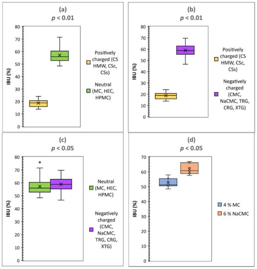 The statistical evaluation (Students’s t-test) of IBU release for particular groups of the hydrogels, characteristic by their charge. Comparison of (a) cationic hydrogels with neutral ones, p = 0.000, (b) cationic hydrogels with anionic ones, p = 0.000, (c) neutral hydrogels with anionic ones, p = 0.044, (d) neutral hydrogel (4% MC) with anionic one (6% NaCMC), having similar viscosities of 32.05 and 40.04 N.S m−2 at shear rate 6.45 s−1, respectively, p = 0.012.