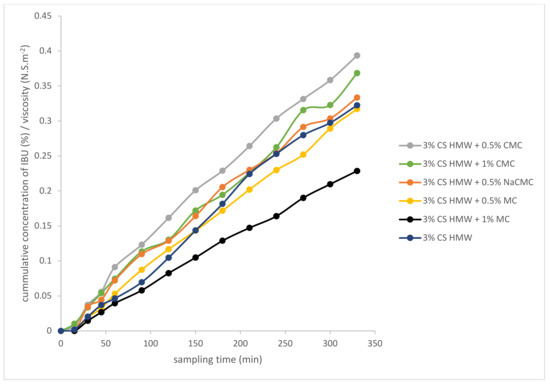 The cumulative amount of IBU released from chosen combinations of hydrogels in time, related to viscosity.