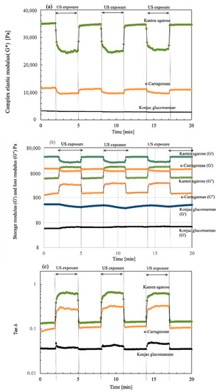 To investigate hydrogel behaviors under US exposure, sono-device-enabled rheometry is useful to detect viscoelastic data in situ during US operation [28]. As described herein, the softening of cellulose hydrogel occurred instantaneously under US irradiation and reverted to its original viscoelastic properties when the US was ceased. In biomass cellulose and chitin hydrogels, US exposure caused gel softening in chitin and chitin–cellulose composites [26]. Nevertheless, little is known about other biomass hydrogels, especially Kanten agarose, carrageenan, and konjac glucomannan, all of which are well-known food agents.