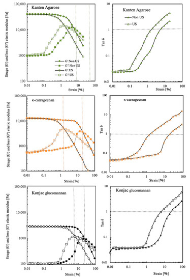 G′ and G″ moduli and tan δ of Kanten agarose, κ-carrageenan, and konjac glucomannan hydrogels at different strain% in the absence (closed symbol) and presence of US exposure (opened symbol).