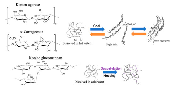Gelation illustration of Kanten agarose, κ-carrageenan, and konjac glucomannan hydrogels.