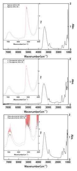 We attempted to observe the infrared (IR) spectrum of the hydrogel to analyze its composition. Figure 4 shows FT-IR and near-IR spectra of dried polysaccharides and wet state hydrogels with and without US exposure for wavenumbers of 1000–7500 cm−1. The FT-IR spectra of the dried samples showed clear IR bands in the range of 1000–4000 cm−1. However, the results for the hydrogel sample retaining water were all extremely large absorbance, with values of more than 3 in this wavenumber region. As described, the used hydrogels retained high water contents of 3384%, 3449%, and 3490%, respectively, for Kanten agarose, κ-carrageenan, and konjac glucomannan; the polysaccharide that was used holds about 30 times more water. Therefore, it is difficult to analyze polysaccharide components in these IR spectral measurements because of water interference. However, the hydrogel spectra show two distinct near-infrared peaks at 6800–6900 cm−1 and 5000 cm−1 in the near-IR region (inserted spectra), which are attributed, respectively, to symmetric and antisymmetric OH-stretching modes (first overtone) and the combined tone [41,42]. In cases of the observed wavenumber, the values of Kanten agarose and κ-carrageenan for the first overtone were 6875 and 6871 cm−1, respectively. These were shifted toward somewhat longer regions of 6885 cm−1 and 6887 cm−1 by US exposure. The difference between those peak shifts observed with and without US exposure was attributable to the weakening of intramolecular hydrogen bonds [43] by US exposure. The US exposure to such polysaccharide hydrogel influenced the surrounding water conditions.