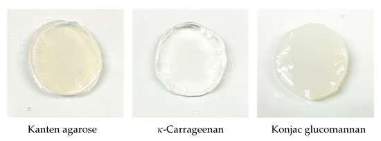Dry agarose (Kanten) purchased from Japan Garlic Co., Ltd. (Gunma, Japan) was soaked in cold water and was then boiled to dissolve the carbohydrates. Then, the aqueous solution was cooled at room temperature for gelation. Konjac glucomannan (Mac Food co. Ltd., Gunma, Japan) and the hydrogel of konjac were used after washing with excess water before use for experiments. Powders of Kanten and κ-carrageenan (Tokyo Kasei Kogyo Co. Ltd., Tokyo, Japan) were used for the following hydrogel preparation. Each 5.2 g powder was stirred to disperse it in distilled water (200 mL) at 70 °C for 2 h. After the dispersed solution was dissolved well, it was poured into the mold vessel, of which the surface was coated by Teflon. A mold containing agarose or carrageenan solution was left at rest at room temperature for 2 h. Then, the molding solution was cooled to 4 °C for 48 h during the gelation process. Thus, each hydrogel was obtained, as shown in Figure 5.