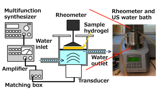 Viscoelasticity of hydrogels was measured (MCR 301; Anton Paar Japan, Tokyo, Japan). As Figure 6 shows, a US water bath (φ86 mm × 65 mm) was equipped with a Langevin-type transducer (HEC-45242M; Honda Electronics Co. Ltd., Aichi, Japan) at the bottom.