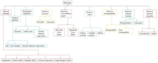 Hydrogels can be classified into multiple ways with various viewpoints based on the literature. Based on phase transition like gel-sol reactions due to physical or chemical, or biochemical stimulation. The physical stimulants comprise temperature, electric fields, magnetic fields, solvent composition, light strength, and stress. In contrast, chemical stimulation includes pH, ionic strength, specific chemical compositions, and biochemical stimulation by enzymes and amino acids [24]. Based on their pore size (nanogels and microgels), based on the polymer structure (homopolymers and copolymers), based on cross-linking (physically cross-linked and chemically cross-linked), based on degradation (biodegradable, non-degradable) and their source (natural, synthetic, or hybrid), and based on physical properties (conventional, and smart) [20], the classification of hydrogel is shown in Figure 1.