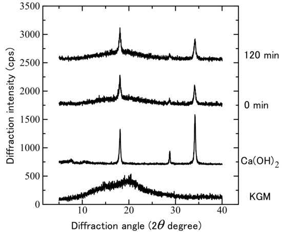 Figure 1 shows the XRD profiles of the KGMH mixtures containing 16 w/w% Ca(OH)2 after various grinding times. The XRD profile of Ca(OH)2 showed specific diffraction peaks at 18°, 29°, and 34°, whereas the profile of KGM showed a halo pattern without any diffraction peaks. Therefore, the profile of KGMH0 (a physical mixture) only showed specific peaks due to Ca(OH)2, and the profiles of the ground KGMH mixtures (KGMH120) did not change significantly up to 120 min of grinding.