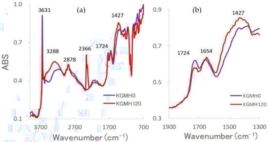 Furthermore, in the FT-IR spectra, the peaks of the ground KGMH mixtures (Figure 3) were assigned based on a previous study. The peaks at 3631 and 3288 cm−1 were attributed to the free and hydrogen-bonded stretching vibrations of the OH group [25]. The peaks at 2878 and 1427 cm−1 were due to the stretching and angular vibrations of CH in the alkene [25] and CO32- of CaCO3 [26], respectively. The peak at 1724 cm−1 was attributed to the stretching vibration of C=O in the esters’ acetyl groups [27]. The peaks at 2366 and 1654 cm−1 were attributed to the CO stretching vibration in adsorbed carbon dioxide gas [28] and the stretching vibration of OH in water [25], respectively.