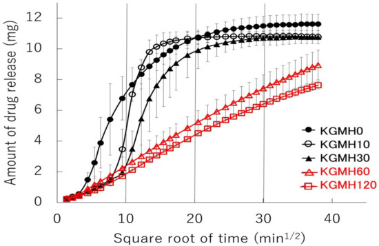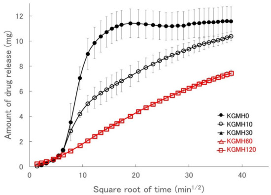 Figure 5 shows photographs of the KGMH tablets after 24 h during the drug release tests. After 24 h, the KGMH0, KGMH10, and KGMH30 tablets had completely disintegrated, but the KGMH60 and KGMH120 tablets retained a tablet shape. This result indicates that it was possible to control drug release of the KGMH polymeric matrix tablets by mechanochemical treatment in a ball mill. Therefore, it was hypothesized that the drug release profiles from the KGMH60 and KGMH120 matrix tablets followed the Higuchi Equation (1) [24]: