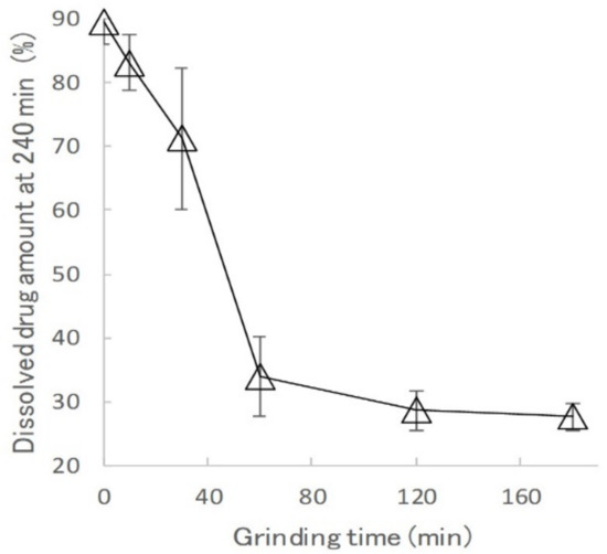 Figure 4 shows the drug release profiles of the polymer matrix tablets prepared from KGMH mixtures ground for 0–120 min. The KGMH0 tablets disintegrated at approximately 30 min and released over 75% of the drug within 150 min. However, based on the drug release profiles of ground KGMH tablets, the time required for tablet disintegration increased as the grinding time increased, and drug release was suppressed. Drug release from the KGMH tablets was delayed with increasing grinding time because a typical gel layer was visibly formed on the outside of the KGMH60 and KGMH120 tablets.